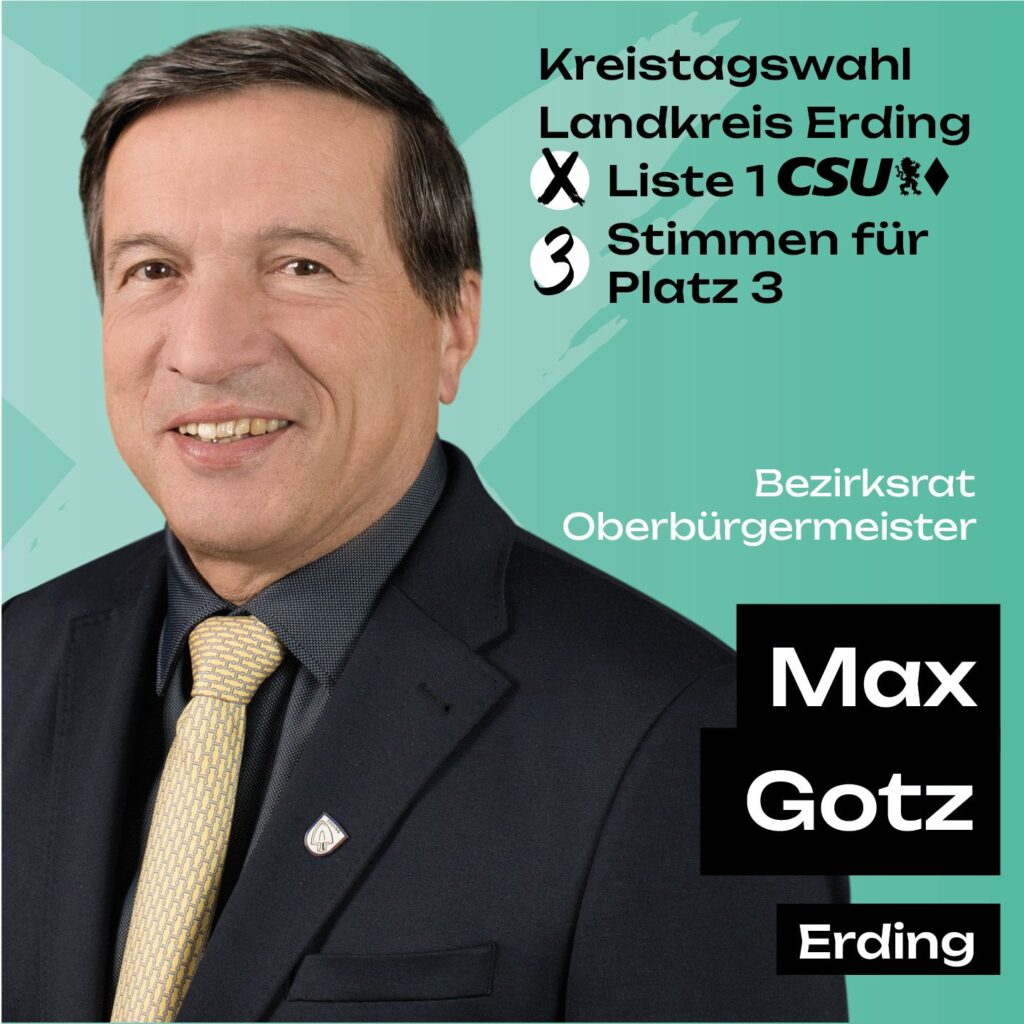 Max Gotz ist Kreisrat und Oberbürgermeister der Stadt Erding. Im Kreistag engagiert er sich u. a. im Krankenhausausschuss, im Ausschuss für Struktur, Verkehr und Umwelt sowie als 2. Stellvertreter im Kreisausschuss und im Ausschuss für Bauen und Energie. Sein politisches Handeln ist geprägt von Verantwortungsbewusstsein und Augenmaß.