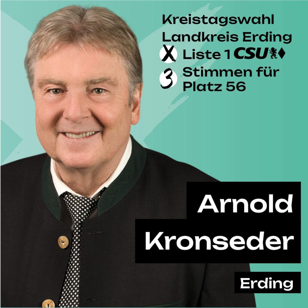Arnold Kronseder ist Kreisvorsitzender der Senioren-Union (SEN) der CSU im Kreisverband Erding. Der staatlich geprüfte Sozialversicherungsfachangestellte und Pharmareferent ist Rentner und selbständig tätiger Fachberater für Gesundheitswirtschaft, Senioren und Soziales. Er lebt in Partnerschaft, ist Vater von zwei Kindern und Großvater von vier Enkeln. Sein langjähriges berufliches und ehrenamtliches Engagement macht ihn zu einem kompetenten Ansprechpartner für die Anliegen älterer Menschen.